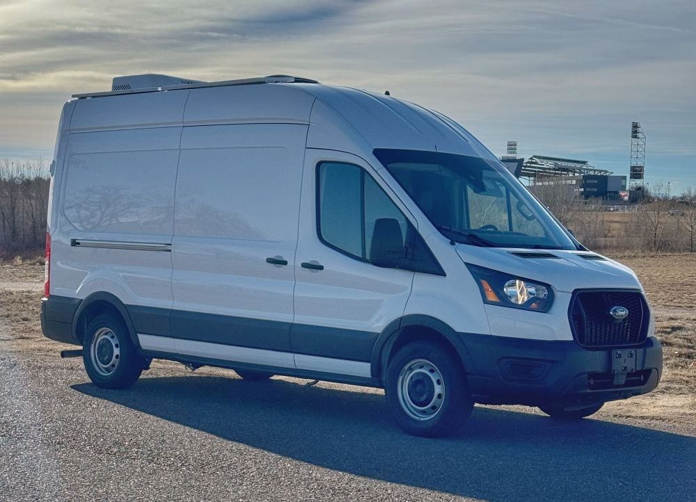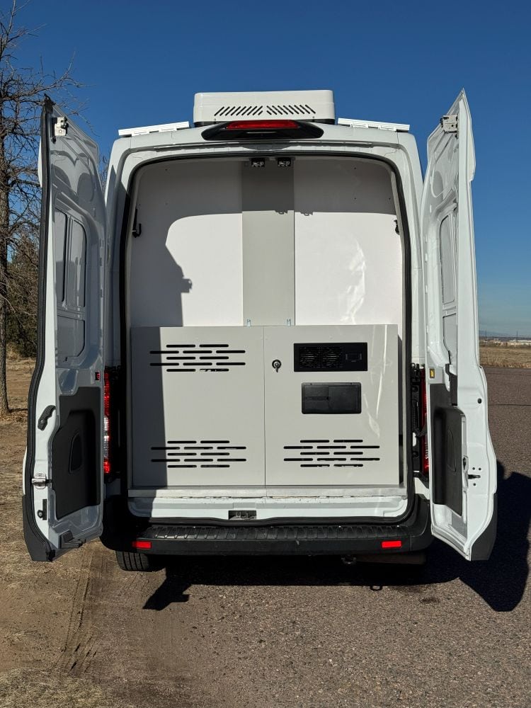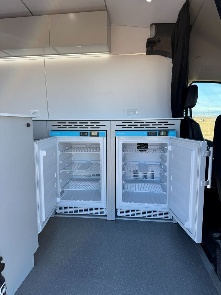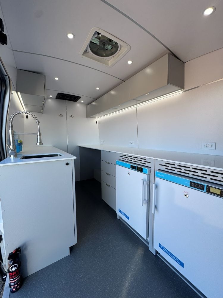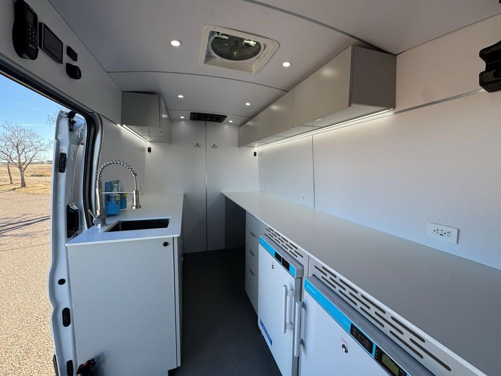 This particular mobile lab conversion includes full climate control, medical freezer and refrigerator, Starlink, and a comfortable workspace for quick, on-site medical testing that producer faster results.